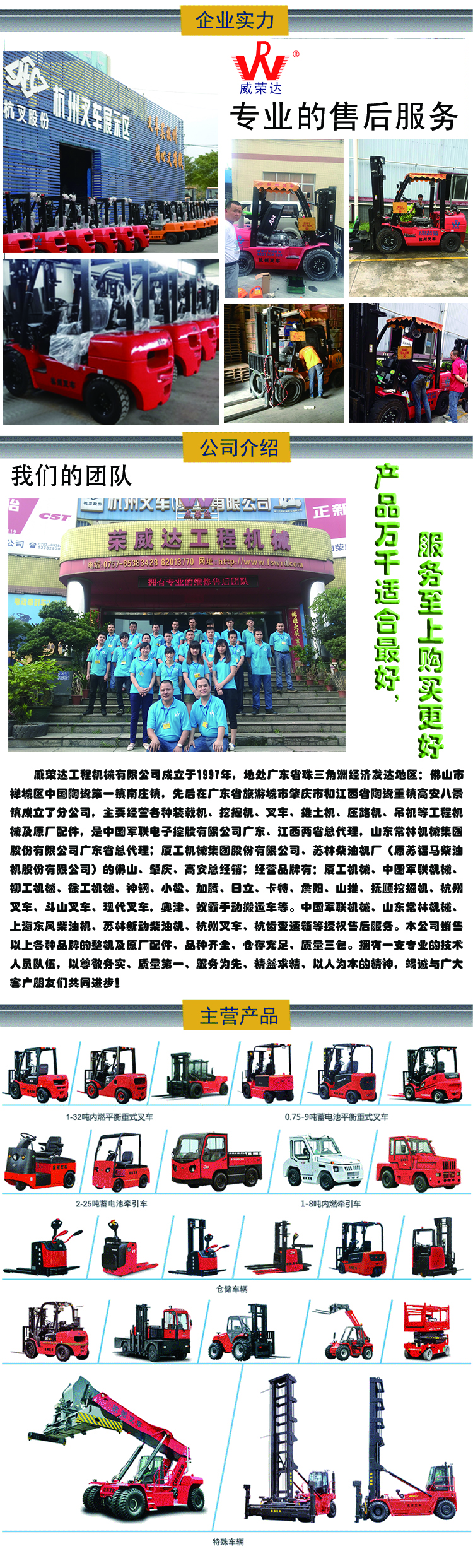 威榮達(dá)工程機(jī)械主要經(jīng)營各種裝載機(jī)、挖掘機(jī)、叉車、推土機(jī)、壓路機(jī)、吊機(jī)等工程機(jī)械整機(jī)及原廠配件銷售,是杭州叉車、廈工鏟車代理商,提供叉車、裝載機(jī)、挖掘機(jī)租賃及維修服務(wù)。